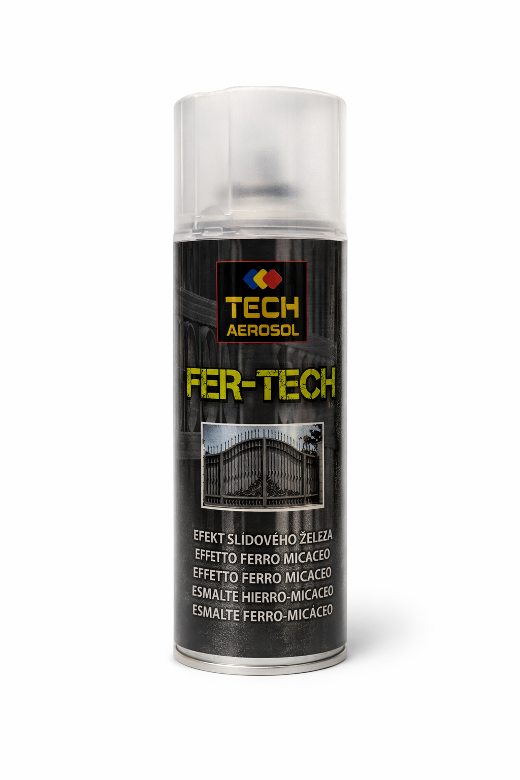 TECH AEROSOL FER-TECH je dekorativní antikorozní nátěr ve spreji s efektem slídového železa. Vytváří hrubší, kovový povrch s vysokou odolností vůči povětrnostním vlivům a mechanickému namáhání. Vhodný pro kovové konstrukce, ploty, brány a zámečnické prvky.
