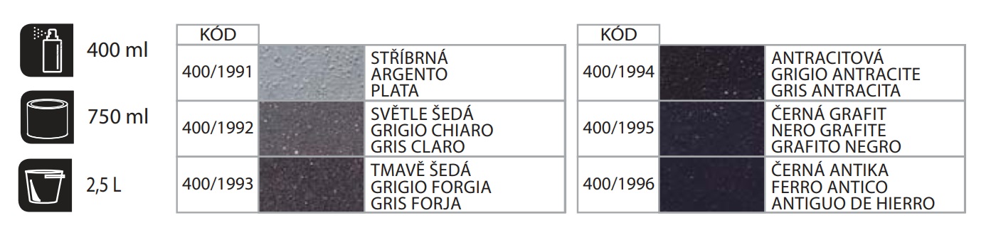 Barva s nádechem starožitného železa, určená pro interiér a exteriér. Barva je na bázi akrylu, vyrobená z lamelové železité slídy a je rychleschnoucí s vysokou kryvostí.Zvlášť určený jako ochrana proti atmosférickým vlivům a jako dekorace bytových doplňků. V průběhu času zůstává neměnný a představuje výraznou odolnost proti korozi, je možné jej ponechat jako finální nátěr, po zaschnutí lze nástřik nanášet opakovaně.