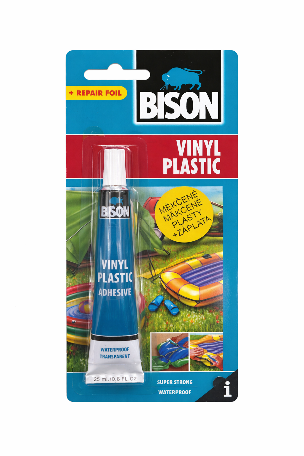 BISON Vinyl Plastic je transparentní, voděodolné a velmi silné lepidlo určené pro lepení a opravy měkčených plastů (PVC). Ideální pro opravy nafukovacích předmětů, bazénů, matrací nebo stanů.