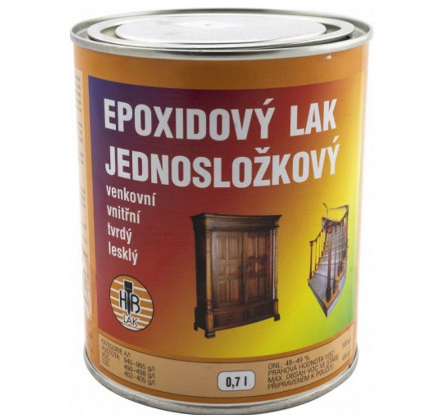 Epoxidový lak jednosložkový je určen na dřevo a kov pro venkovní a vnitřní. Epoxidový lak jednosložkový je roztok modifikované epoxidové pryskyřice v xylenu, sikativovaný ChS-P urychlovačem.