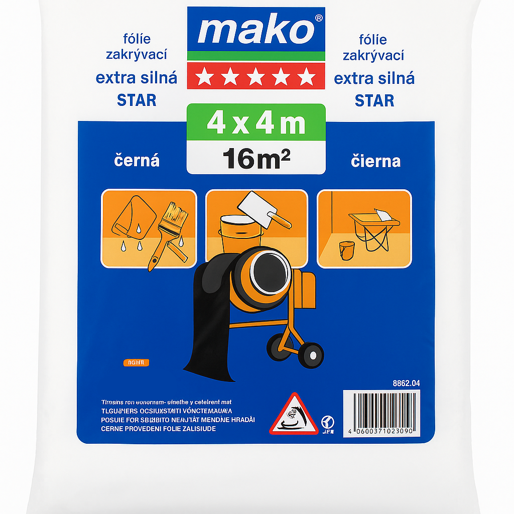 Zakryvací fólie Mako Extra Silná STAR je určena pro maximální ochranu při malířských, stavebních a renovačních pracích. Díky extra silnému materiálu (tloušťka cca 0,08 mm) je mimořádně odolná proti protržení a vhodná i pro zakrývání větších a zatížených ploch. Černé provedení fólie zajišťuje nejen vysokou pevnost, ale i lepší odolnost proti slunečnímu záření.