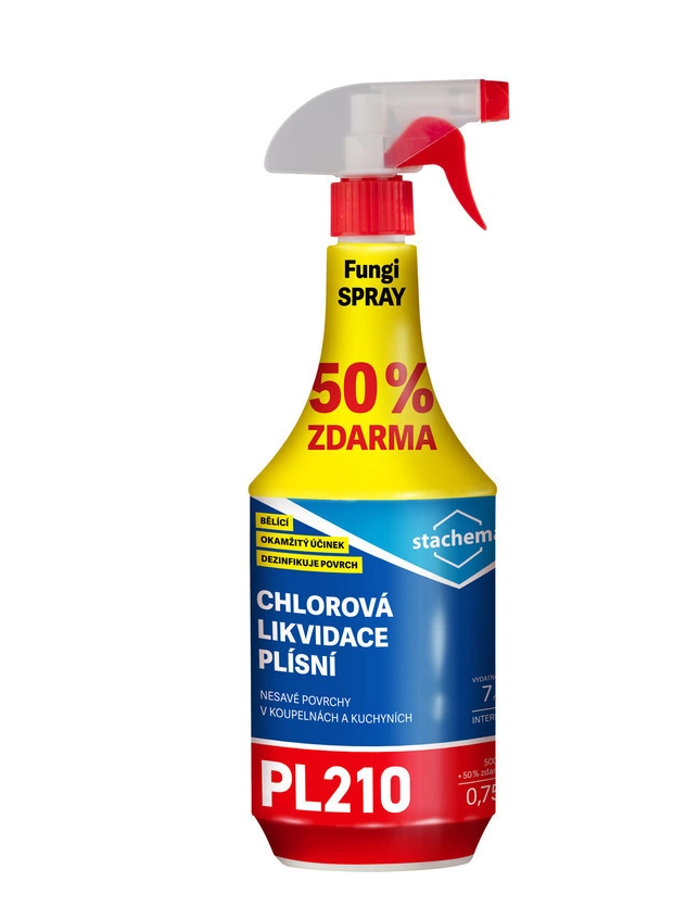 FungiSPRAY chlorový ORIGINAL / PL210 je kapalný přípravek určený k likvidaci plísní v domácnostech, zejména v koupelnách na vany a umyvadla, obklady, spáry mezi obklady, dlažbu a ve zdravotnických a potravinářských zařízeních. APLIKACE Plíseň se před aplikací přípravku neodstraňuje, aby nedošlo k rozptýlení zdraví škodlivých výtrusů! Napadená místa se postříkají ze vzdálenosti cca 5 cm a po 20 minutách působení se omyjí vodou nebo se přípravek nechá zaschnout. Při silném napadení plísní je nutno postup opakovat. Po použití se mechanický rozprašovač odšroubuje a propláchne vodou.
