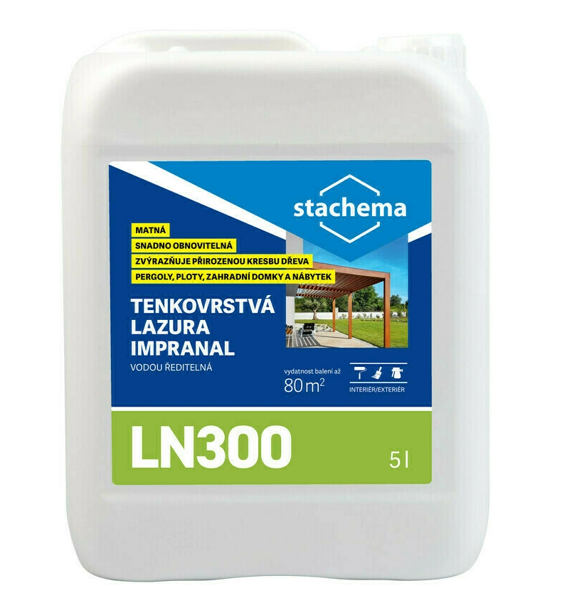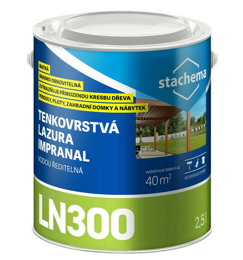 Tenkovrstvá, vodou ředitelná lazura určená na dřevěné povrchy v interiéru i exteriéru např. obložení balkónů a fasád, pergoly, zahradní nábytek, ploty, kůlny apod. Povrch působí dojmem neošetřeného dřeva. Je dále doporučena jako základní nátěr pod LN400 / IMPRANAL PROFI od výrobce STACHEMA. Není vhodná k nátěrům pochozích ploch (pro pochozí plochy v interiérech se pro finální úpravu doporučuje výrobek LP100 / LP110 od výrobce STACHEMA). Lazura je lehce přetíratelná s dobrou přilnavostí k povrchu. Chrání dřevo před zašpiněním povětrnostními vlivy a stárnutím. Barevné varianty jsou UV stabilní. Vhodná je i do