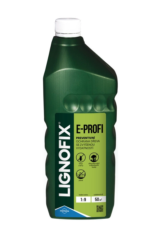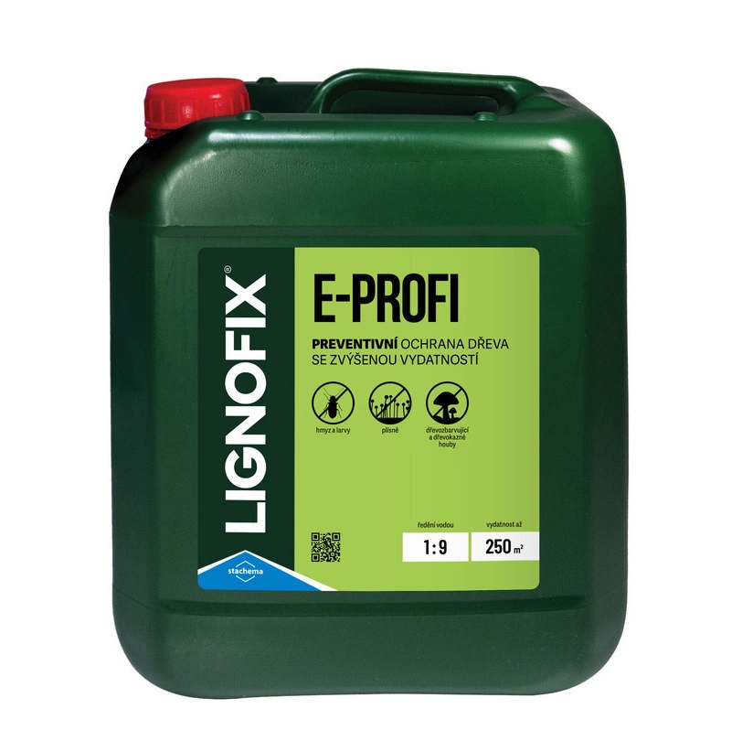 Lignofix E-Profi je koncentrovaný kapalný přípravek s preventivním účinkem proti dřevokaznému hmyzu (např. červotoč, tesařík), dřevokazným houbám (např. dřevomorka domácí), dřevozbarvujícím houbám a plísním. Je určen k povrchové impregnaci dřeva v interiérech (např. střešní konstrukce, podlahy)a v exteriérech bez přímého a trvalého kontaktu se zemí (např. střešní podbití,dřevěné stavby, ploty) a také k ochraně zdiva a omítek proti prorůstání dřevokaznými houbami.
