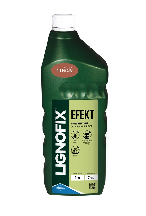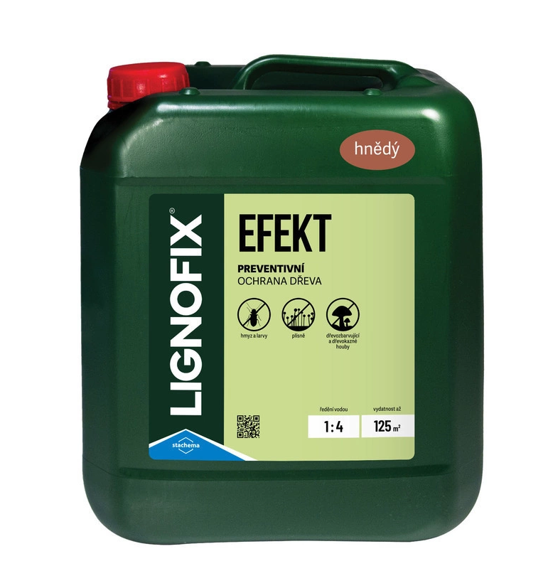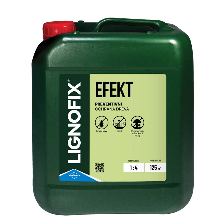 Lignofix Efekt je koncentrovaný kapalný přípravek s preventivním účinkem proti dřevokaznému hmyzu (např. červotoč, tesařík), dřevokazným houbám (např. dřevomorka domácí), dřevozbarvujícím houbám a plísním. Je určen k povrchové impregnaci dřeva v interiérech (např. střešní konstrukce, podlahy) a v exteriérech bez přímého a trvalého kontaktu se zemí (např. střešní podbití, dřevěné stavby, ploty) a také k ochraně zdiva a omítek proti prorůstání dřevokaznými houbami.
