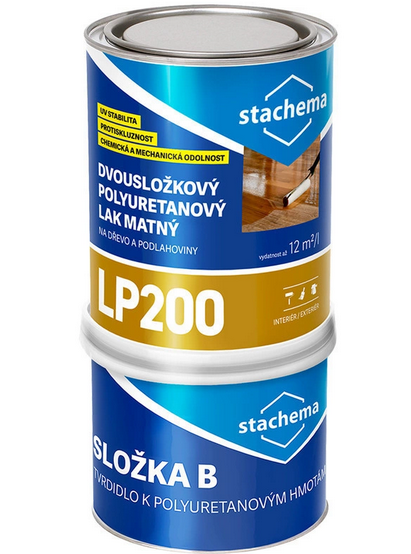 LP200 je dvousložkový polyuretanový lak dodávaný v setu s tvrdidlem. Vytváří transparentní matný povrch s vynikající mechanickou a chemickou odolností. Díky penetračnímu účinku a vysoké přilnavosti je vhodný pro náročné aplikace v interiéru.