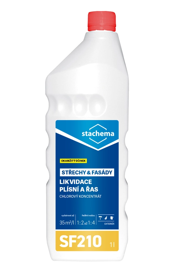 Účinný chlorový kapalný přípravek s čisticím účinkem určený k odstraňování řas, bakterií, plísní, mechů a lišejníků z povrchu fasád, střech a dalších stavebních konstrukcí (například betonových podezdívek, opěrných zdí apod.). Používá se v kombinaci s následným oplachem tlakovou vodou. APLIKACE Přípravek se nanáší stříkáním, válečkem nebo štětkou. Přípravek lze také nanášet pěnovací tryskou tlakových myček. Po aplikaci na kontaminovanou plochu se přípravek nechá působit minimálně 20 minut. Viditelné projevy působení nastávají zpravidla do 30 minut, přičemž k biocidnímu účinku dochází již po 15 min., vyjma řas, kde je možné posoudit biocidní efekt až po 24 hodinách. V případě potřeby se může po této době nanesení prostředku zopakovat. Přípravek nemá preventivní účinnost. Degradační produkty vzniklé reakcí přípravku s nečistotami (kontaminací) se musí následně důkladně omýt tlakovou vodou včetně omytí použitých nástrojů, zařízení, případných konstrukcí na fasádě apod. Po ošetření a likvidaci řas a plísní přípravkem SF210 se pro dlouhodobou preventivní ochranu povrchů proti jejich opětovnému růstu doporučuje vyčištěný povrch natřít přípravkem SF310 .
