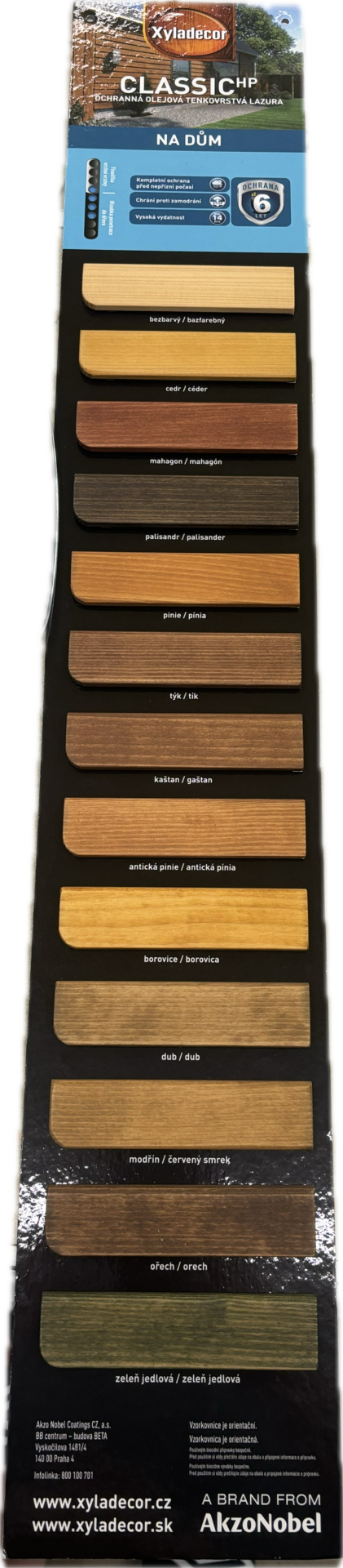Xyladecor Classic HP (High Protection) je ochranná tenkovrstvá lazura na dřevo na rozpouštědlové bázi pro vnější použití. Obsahuje fungicidní složku, která účinně působí proti houbám způsobujícím modrání dřeva. Krémová konzistence usnadňuje natírání a lépe penetruje. Zvýšená přilnavost další vrstvy. Vytváří mikroporézní saténový povrch, který chrání proti UV záření a nepřízním počasí. Zvýrazňuje strukturu dřeva. Je určen pro veškeré dřevěné povrchy, které nejsou v přímém styku s půdou nebo povrchovou vodou, jako jsou obklady domů, chaty, altány, pergoly, ploty, balkony, okna, dveře a jiné dřevěné povrchy. Pro intenzivnější ochranu v exteriéru proti modrání a hnilobě dřeva, doporučujeme podklad napustit impregnačním nátěrem Xyladecor Xylamon.